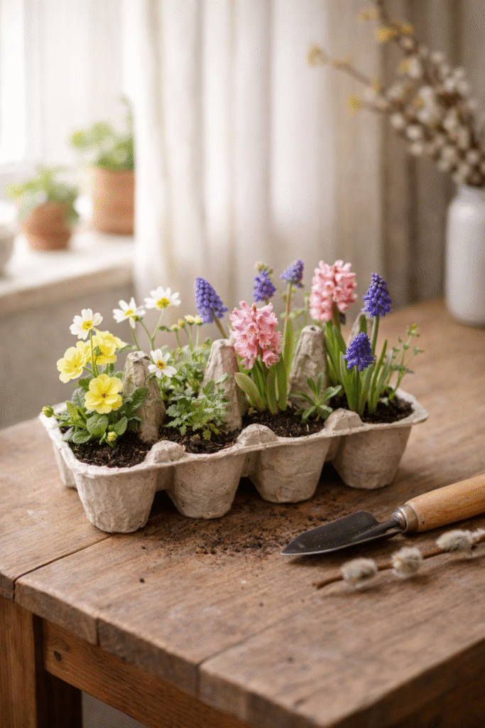 Ved at fylde hver fordybning med jord og frø kan du skabe en lille “påskehave”, hvor spirer og blomster vokser frem over tid.