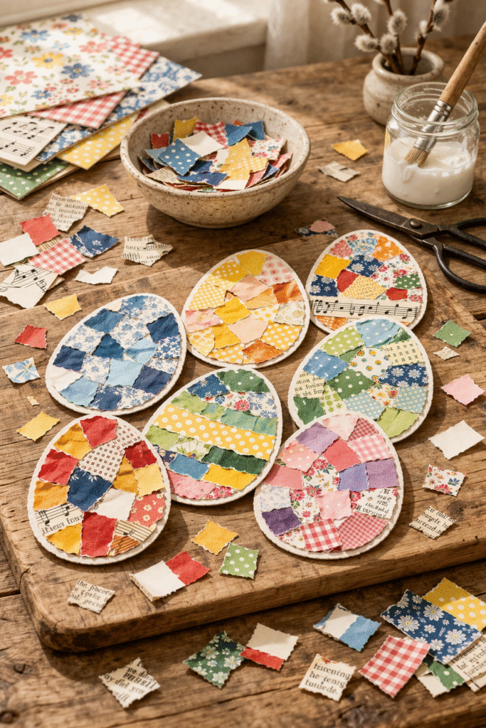 Små papirstykker fra magasiner, gavepapir eller gamle kort kan bruges til at lave mosaikæg.